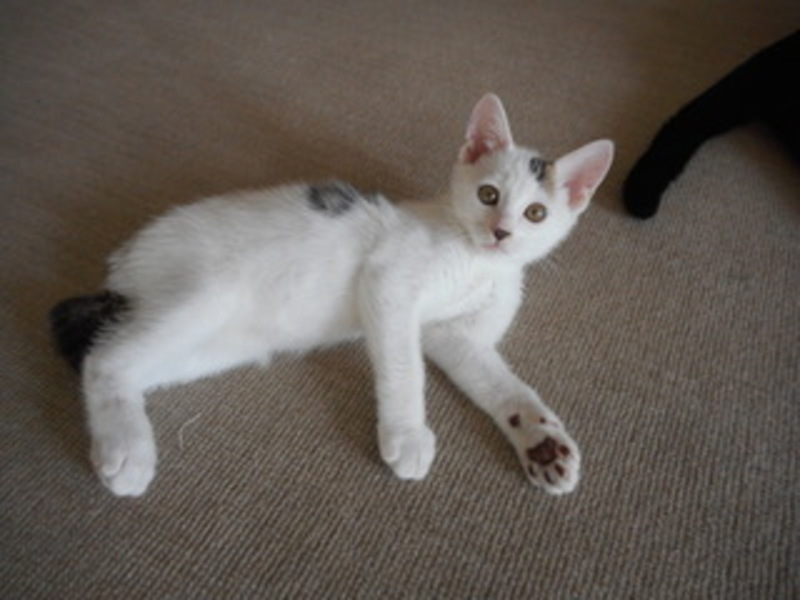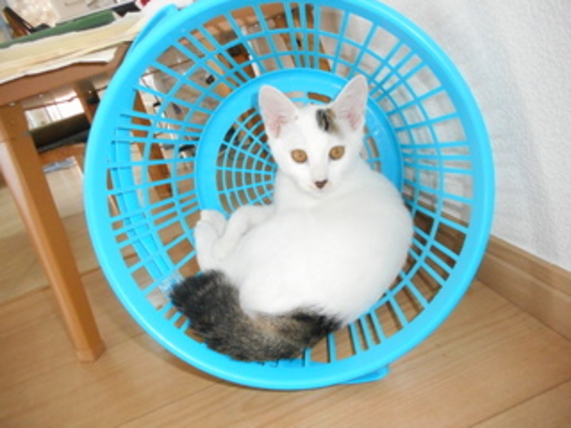 | 特徴(性格など) | 白に茶と黒の混じったキジ猫です。犬や猫、人にも良くなつき、初めて会った人にも抱っこされます。元気いっぱいで、おもちゃでよく遊び、おもちゃに飽きると犬や猫の尻尾にじゃれついています。先住猫たちをよく見ていて、トイレもすぐ覚えました。おなかがすいた時だけ、ニャーニャーと泣いて要求します。 | ||