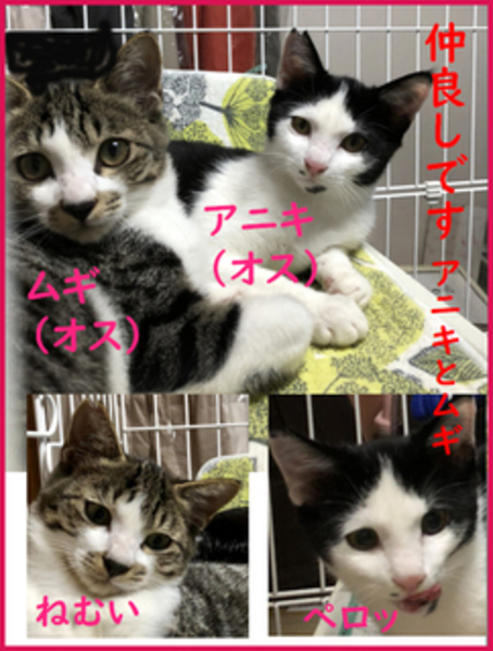 | その他(譲渡条件など) | 豊島区南長崎の住宅地で保護した子猫の4兄弟です。 ★4匹いるのですが、仲の良い2匹づつを、写真合成いたしました★ ★2匹づつ(一緒)のお迎えを希望いたします★ 推定年齢、4か月。現在、保護者宅のケージの中にいます。 元気いっぱいですので、早く狭いところから出して、家族の一員として大切に育ててくれる方のところに送り出したいと思っています。 ★★猫は、仲のよい仲間と暮らしてこそ楽しい人生が送れます。そこで、2匹づつ一緒のお迎えを希望しております。 まずは、お電話でざっくばらんにお話したく存じます。 このページを通じてご連絡いただく際、お電話番号をお書きいただければ幸いです。 保護主のナガイからは、平日でしたら夜間に、土日でしたら昼間にお電話差し上げられると思います。 猫との面会も可能です。保護主は豊島区南長崎在住です。 ※ 猫たちはまだ完全に人間に慣れていませんが、脱走しないようにしていただければ、子猫ですので徐々に慣れると思います。 ※ 去勢・不妊手術した目印として、耳カットがされています。 ■ 次の条件を受け入れて下さいます方を希望します。 ◎ ペット飼育可の住宅であること。 ◎ ドア、窓、ベランダからの脱走に十分気をつけていただき、完全室内飼いして下さること。 ◎ 飼育にはご家族全員の同意があり、日々、猫の世話をできる方が2名以上いること。 (1名様ですと、仮に病気で倒れた場合など、猫の世話人が不在となりますので) ◎ 陽が差し込む、運動不足にならない程度の広さがある等、猫の飼育に適した住環境であること。 ◎ 譲渡後は猫の様子を、写真と共に報告して下さること。 ◎ 動物病院でおこなった処置費用の<一部>をお支払いいただける方。内容は、去勢;不妊手術、血液検査(問題なし)、ノミ取り、虫下し、ワクチンで、1匹1万円です。ただ、2匹一緒のお迎えですので、合計2万円よりお値引きする予定です。町の病院の二分の一から三分の一の額ですので、なにとぞご理解をお願い申し上げます。m(__)m どうぞ宜しくお願い申し上げます。m(__)m |