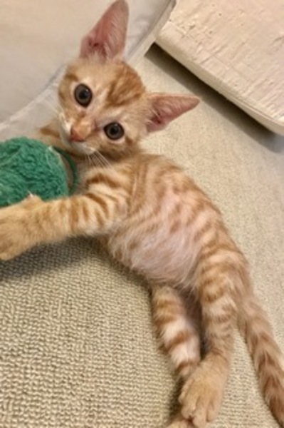 | 特徴(性格など) | 天真爛漫の茶トラの男の子です。 かっこいいハンターごっこの様子は絶品で時間を忘れて眺めてしまうこともあるはずです。 赤ちゃん猫ならではの元気の良さはもちろんのこと。しかし割となまけもの。ゆえに抱っこされやすい「よしのぶ」です。 オレンジの模様はキラキラ輝いて健康です。 憂いを含んだり、おすまししたり、たそがれたり。。子猫は忙しい。 仕事の疲れもいろいろなストレスも吹っ飛ぶ愛嬌を持っています。 おトイレマスターしました。 お留守番も頑張ってできています。 爪とぎもきちんとできます。 猫が好きな様子です。猫同士、上手に遊んでいます。 良く食べて眠り健やかに成長しています。 しっぽは長くまっすぐです。 現在820グラム、健康体です。 よろしくおねがいいたします。 遠方の希望者様、ごめんなさい! |