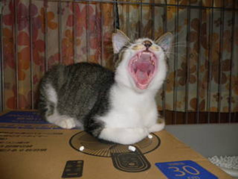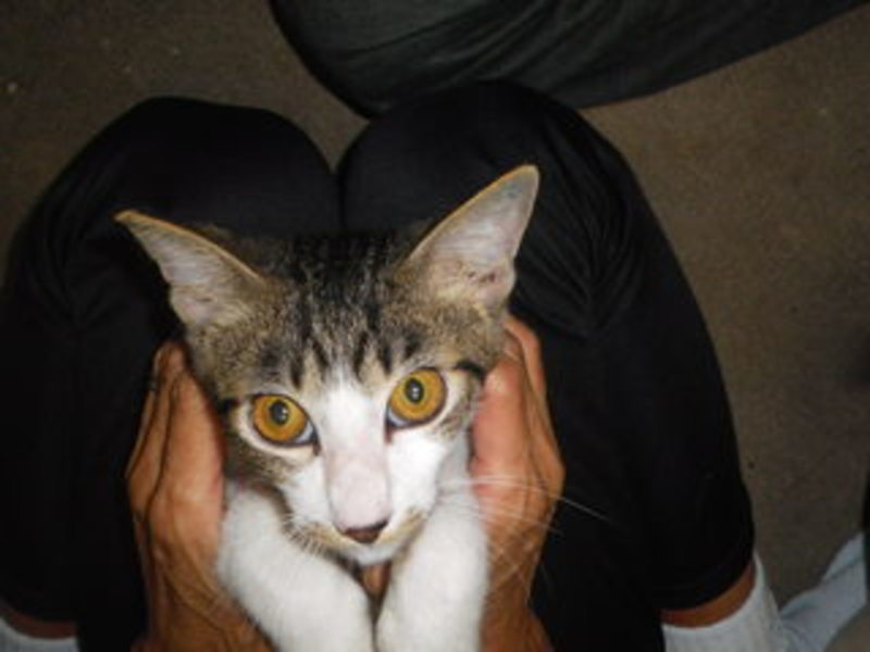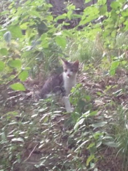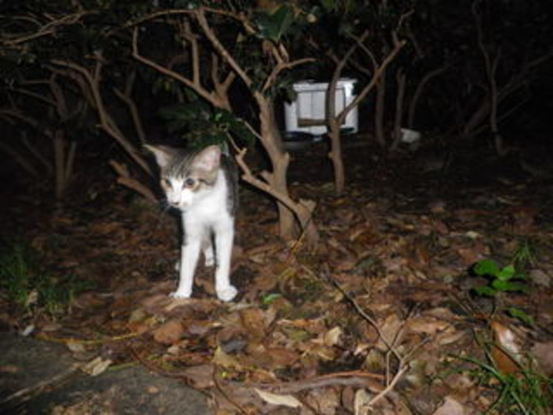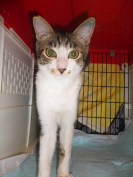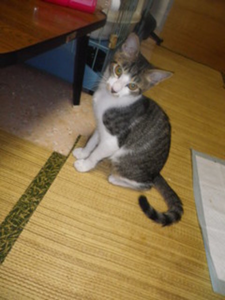 | 特徴(性格など) | 白地にサバ模様。顔も手足も胴も尾も長い。 仮称)おニュー。去勢、ノミダニ駆虫済み。 性格)慎重で陽気。 |