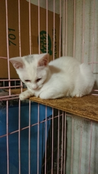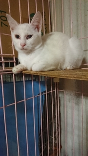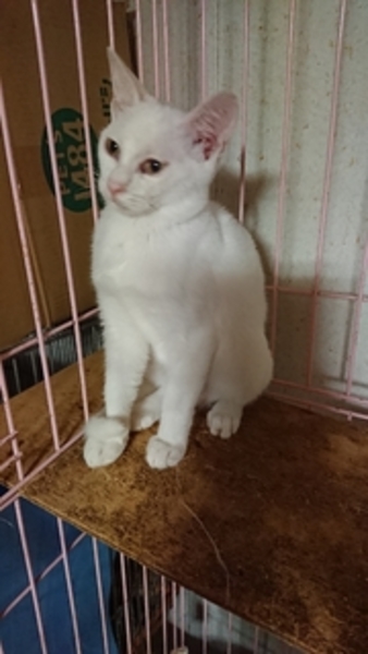| 特徴(性格など) | * 4ヶ月位の真っ白な子猫(メス)。 * とても可愛いお顔をしています。 * 甘えたで穏やかな性格です。 ( 健康状態 ) * 健康状態良好。 * 3種混合ワクチン接種済み。(H30年9月) * 血液検査 (猫エイズ、白血病)異常なし。 (H30年9月) * ノミ、シラミ、耳ダニ、回虫駆除済み。 (H30年9月) |
