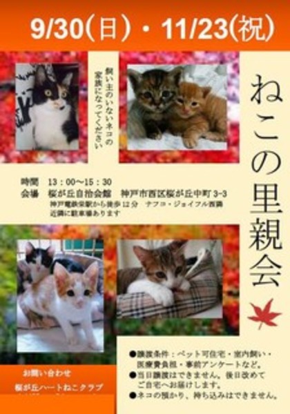 | 里親募集する理由 | 6匹の兄弟と一緒に産まれて5月3日に母猫と保護しました。 保護主さんの代理で掲載しています。 リンちゃんは、下記の譲渡会に参加します。 ☘️☘️☘️猫の譲渡会のお知らせ☘️☘️☘️ 11月23日(㊗️)13:00〜15:30 会場 桜が丘自治会館 〒651ー2226 神戸市西区桜が丘中町3-3 神戸電鉄栄駅から徒歩12分 ナフコ・ジョイフル西隣 近隣に駐車場あります ●譲渡条件:ペット可住宅・室内飼い・医療費負担・事前アンケートなどあります。 ●当日譲渡はしていません。後日改めてご自宅へお届けします。 ●ねこの預かり、持ち込みはできません。 |