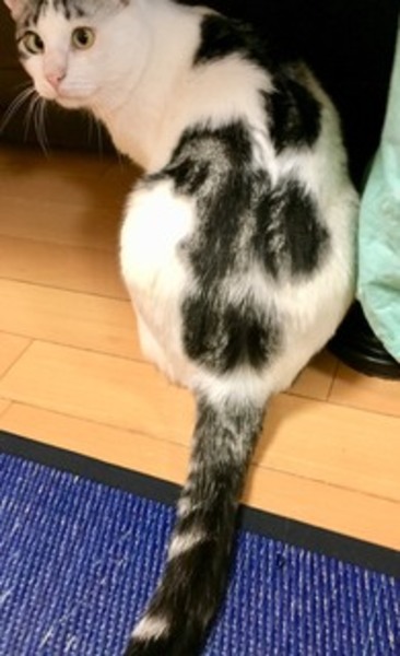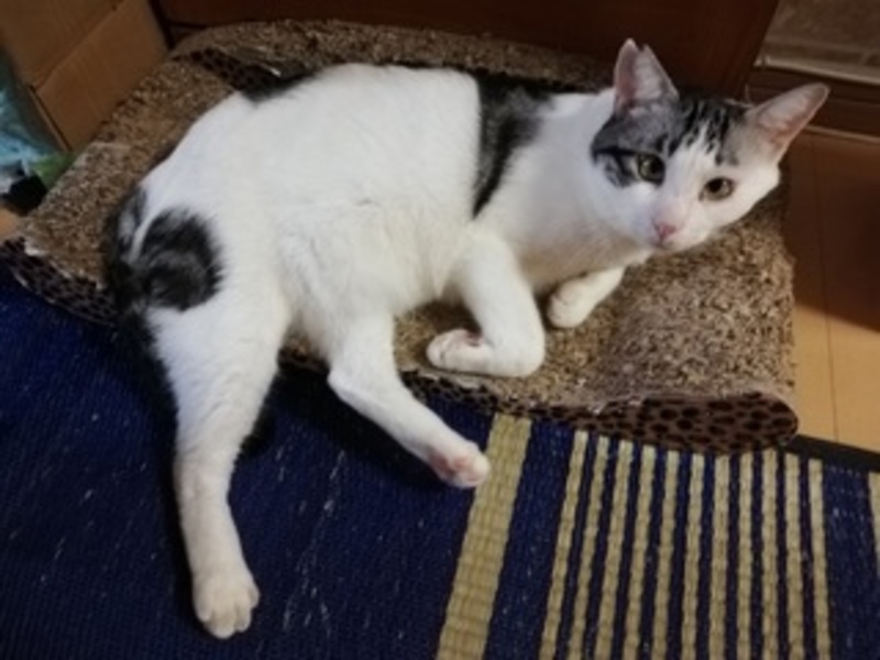 | 特徴(性格など) | アメショーミックス。名前はマルです。まん丸な寄り眼と、大きな体がかわいいです。食いしん坊で、とても元気ですが、ほとんど寝ています。尾は真っすぐ長いです。年齢の割には大人しいです。 | ||