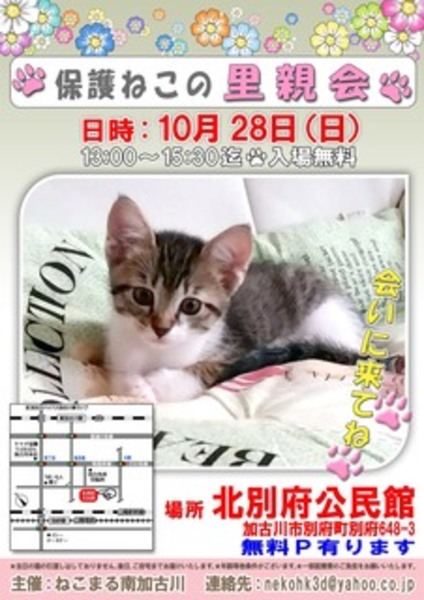 | 里親募集する理由 | 外で保護されました。人慣れしていて捨て猫?かもしれません。 ボランティアさんが去勢して保護しています。 下記の譲渡会に参加します。 ???保護猫の里親会???? 10月28日(日) 13:00〜15:30 11月11日(日) 13:00〜15:30 入場無料です? 会場:北別府公民館 無料駐車場あります。 ※当日の猫の引き渡しはしていません。後日、ご自宅までお届けします。 年齢等条件があります。一部医療費ご負担をお願いいたします。 |