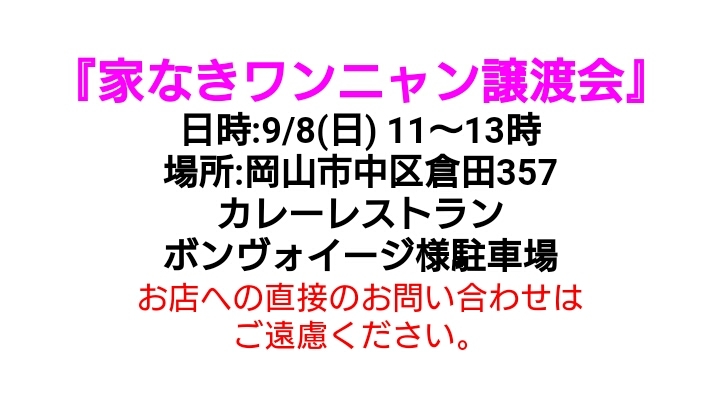 | 譲渡費用(医療費、交通費など) | 3種混合ワクチン接種費用3500円 避妊手術費用18000円の ご負担をお願いしています。 |