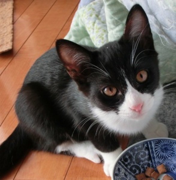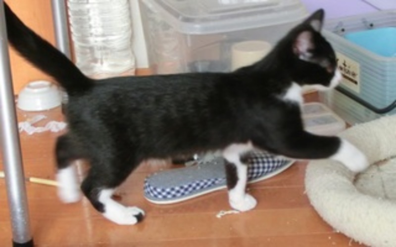 | 特徴(性格など) | 名前は(仮称)カイ。人なつこく遊び大好き。いつも元気で積極的です。 抱っこOK。 「フェリックス」のイラスト猫に似ています。シュッとしたハンサム君。 長しっぽ。茶色の目。 毛色;黒白。5兄弟の長男格。体重1.82Kg(12/1) ウィルス検査(FeLV/FIV)陰性。 駆虫済み。 ワクチン(4種)2回済み |