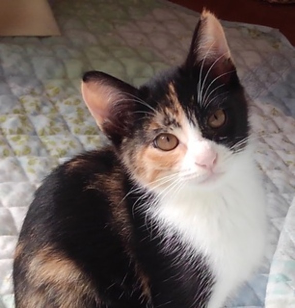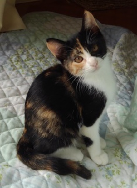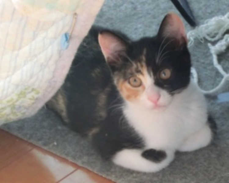 | 特徴(性格など) | 名前は(仮称)カナ。顔の半分が黒のファニーフェイス。 写真では緊張していますが、もっと可憐な感じの子です。臆病だけど好奇心旺盛。3匹の兄さんと活発に遊びます。長しっぽ。茶色の目。 毛色;ミックス調の三毛。5兄弟(雄3、雌2)の女の子「その1」です。 体重1.58Kg(12/1)。 ウィルス検査(FeLV/FIV)陰性。 駆虫済み。 ワクチン(4種)2回済み |
