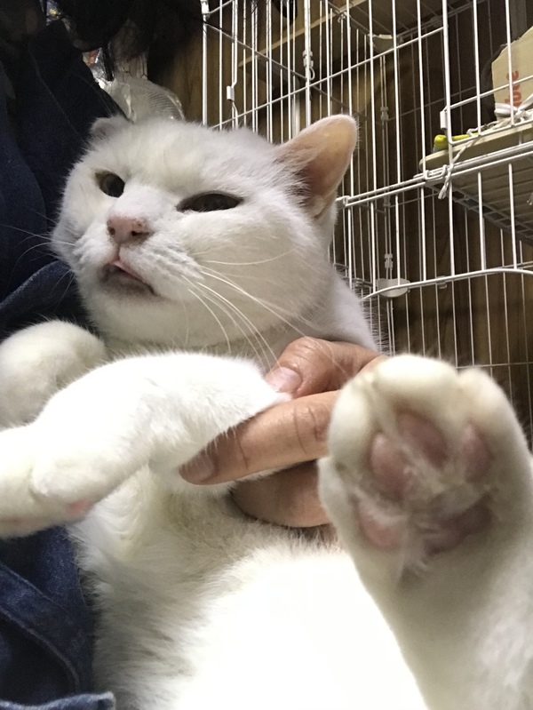 | 特徴(性格など) | (仮名)シロ 真っ白で、ボブテイル。 食欲旺盛で、元気です。 血液検査、白血病陰性、エイズ陽性。 人に慣れるのは早く、甘えん坊で、決して人に爪を立てることはありません。 甘噛みもとっても上手なお利口さんです。 猫に対しては、怖がりの為、先住猫が寛大な子か1匹飼いが向いてる子です。 |