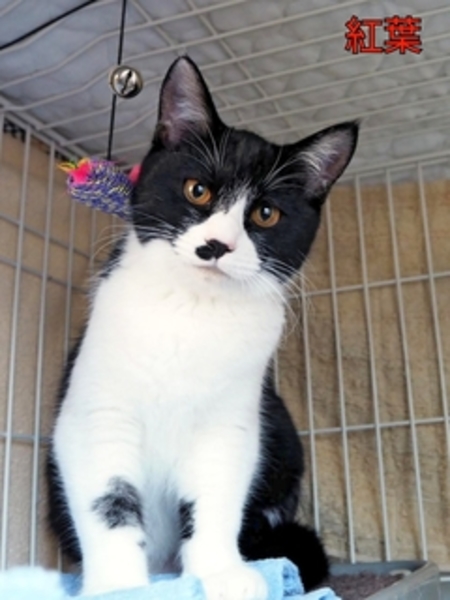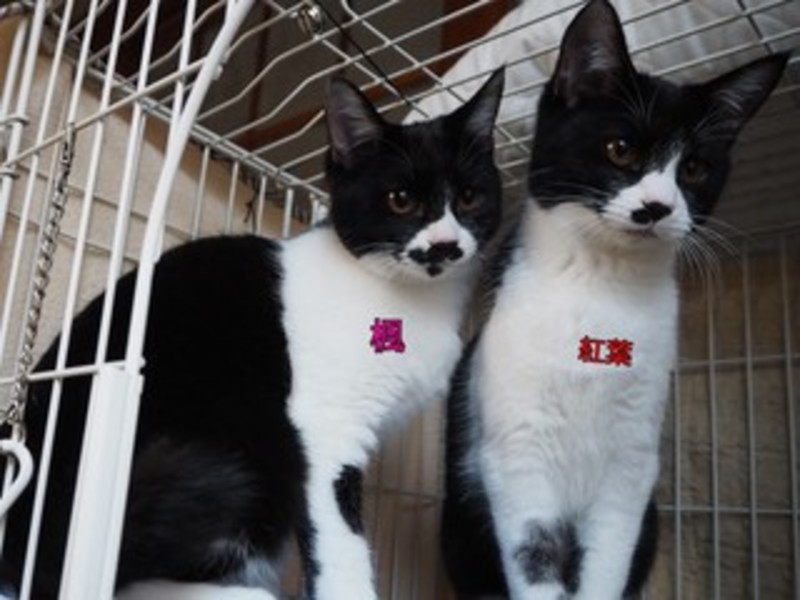 | 特徴(性格など) | 落ち葉の秋に捨てられた楓と紅葉のハチワレ姉妹です。 2匹ともとても人懐っこく、毛並みがきれいな猫ちゃんで、一緒に遊んであげるともう嬉しくて嬉しくてデレデレになっています。 |