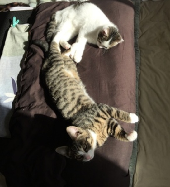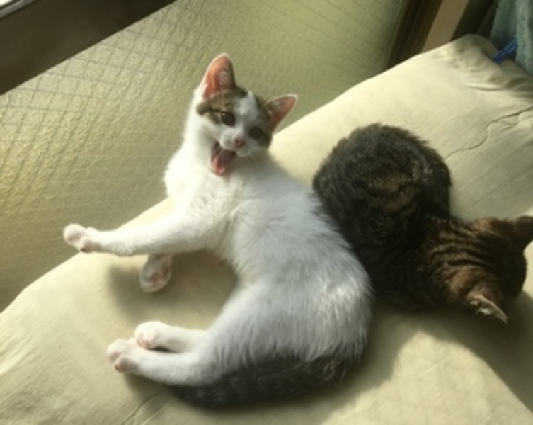 | 特徴(性格など) | 小柄なサビ 健康そのもの マイペース女子 時折真剣に甘えてみせるのがチャームポイント 単独飼いも歓迎しますが、 新入りハウスメイトの初心者向きハンサム、グレーきじ子猫と一緒にいかが。 (画像3=なつこく美しい、肩乗りチビ 4=珍しい色のモカきじ坊っちゃん 5=4ヶ月兄弟の美女ママ は便乗広報、里親絶賛募集中!!!! 画像2とのミックスもOKかも) |