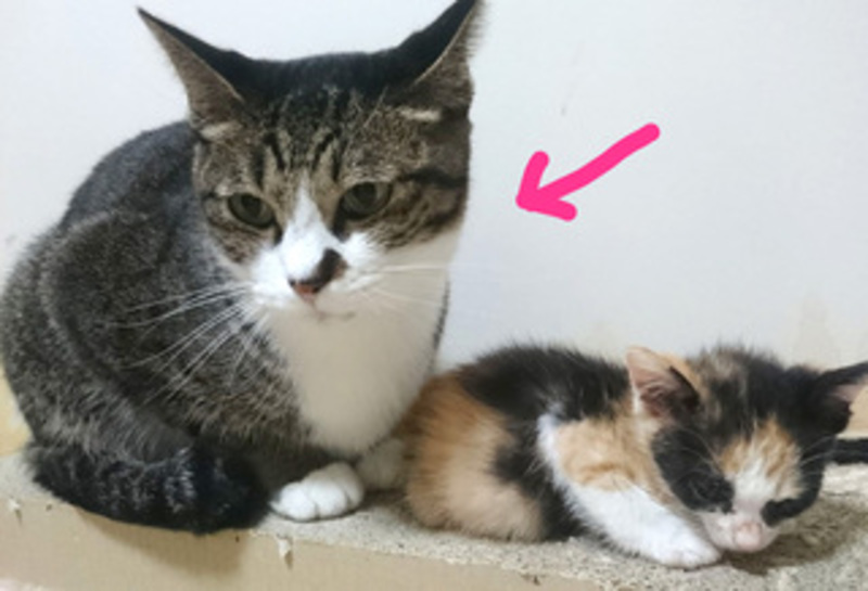 | 特徴(性格など) | 一緒に保護されている子猫たちのお世話をする、優しいキジ白です。仮名は「ママ美」ちゃんです。 避妊手術済・ワクチン済 |