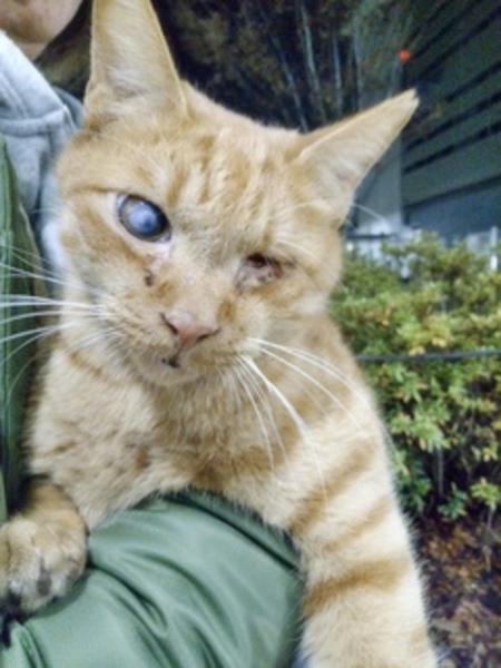 | 里親募集する理由 | 公園に突如現れた茶トラ猫。 目はこんな感じですが、とても人懐っこく甘えん坊な子だっだので保護しました。 我が家はすでに犬と猫3匹いますし、諸事情があり飼うことができません。 優しい里親さんを募集したいと思います。 |