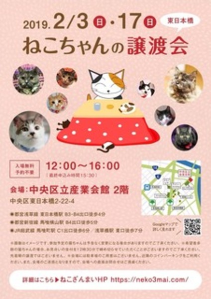 | その他(譲渡条件など) | 2月3日(日)12:00〜16:00(最終申込15:30) ねこざんまい譲渡会に参加予定です! 《会場のご案内はこちら》 https://ameblo.jp/neko3mai/entry-12434851101.html 希望の猫ちゃんがいる場合は、12時に会場へお越し下さい。 先着順ではございませんが、同じ猫ちゃんに複数名の希望者さまがいらっしゃる場合は、12時半にお見合い受付を締め切らせていただく場合がございます。 《家族募集中猫ちゃん一覧はこちら》http://www.neko3mai.com/entrycats/entrycats.html 《いつ里里親会情報ページはこちら》http://www.satoya-boshu.net/keiji/viewtopic.php?f=3&t=4828 ★★★ご来場前に必ずご確認下さい★★★ 《里親様へお願いはこちら》http://www.neko3mai.com/condition/condition.html 参加猫ちゃんは、それぞれ保護主(実際に猫ちゃんを自宅に入れ、保護をしている方)が異なります。 詳しい条件なども異なる場合がございますので、会場内で直接保護主とお話ください。 〖共通条件〗 1.終生飼育 2.完全室内飼い 3.脱走防止対策へのご協力 4.避妊去勢手術 5.契約書類へのサイン 6.定期報告 7.医療費等の負担 当日の猫ちゃんを連れて帰ることはできません。後日、保護主が里親様のご自宅までお届け致します。 その為、移動の際の猫ちゃんの負担を月齢などから考慮し、お届け地区を限定させて頂くこともございますのでご了承ください。 |