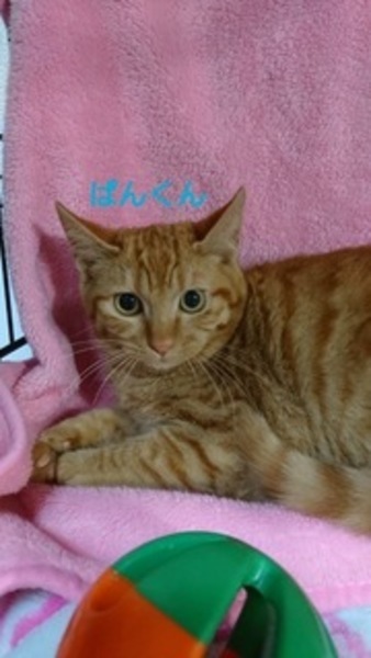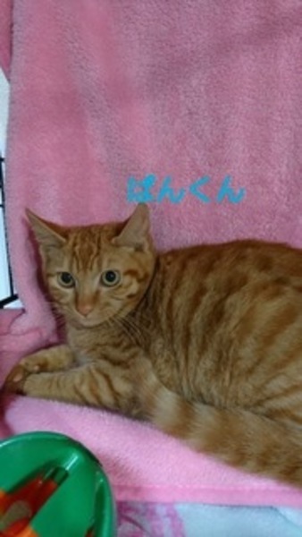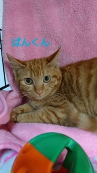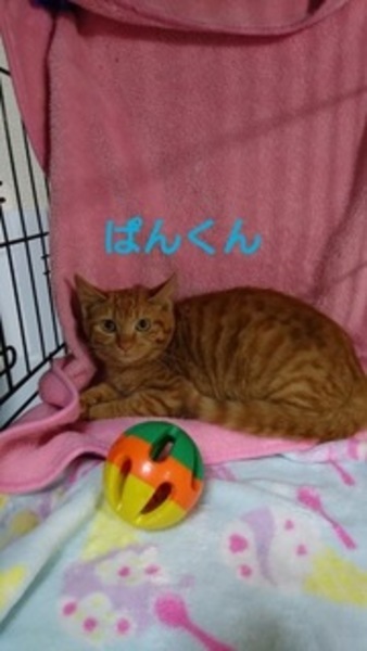 | 特徴(性格など) | 仮名「ぱんくん」 ワクチン済み、ブロードライン済み、ウイルス検査白血病、エイズ共に陰性。茶トラの男の子。 丸くて可愛い目がチャームポイントのぱんくんです。 まだ自分から寄ってくるほどには馴れていませんが抱っこはさせてくれます。 馴れてくれば優しい性格で甘えん坊になるタイプだと思います。 他の猫達とケンカをしたりすることも無いので先住さんがいるお宅でも大丈夫です。 |