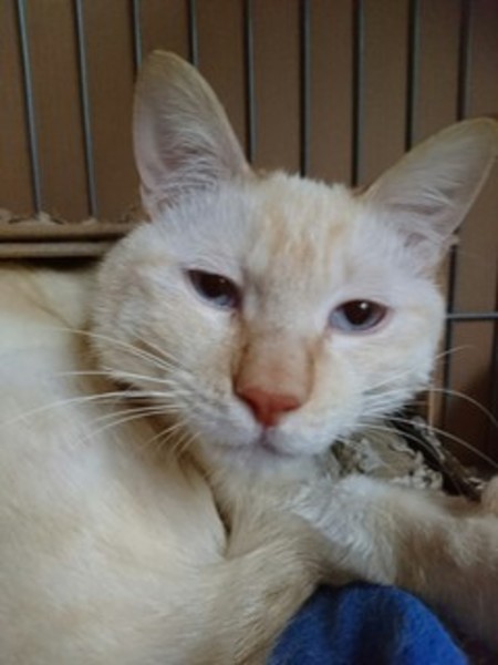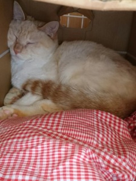 | 特徴(性格など) | 仮名 しまお(しましまの尾だから) 薄茶白で長しっぽのスレンダー体型。 人懐こい。 おとなしくて控えめな性格。 あまり鳴かない。 人が好きで顔を見ただけでゴロゴロ喉を鳴らす。 |