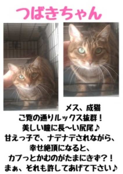 | 特徴(性格など) | つばき、避妊済メス、成猫 飼育放棄されました 人なつこく甘えっ子。 甘えながら噛むのがたまにきず 詳細はこちら https://ameblo.jp/coconyanikkanoenmusubi/entry-12440494354.html 平日でしたらお見合い可能です。 |