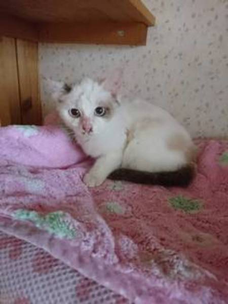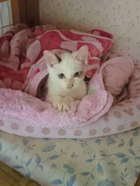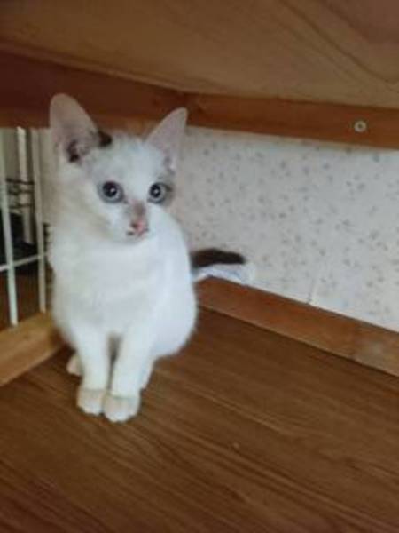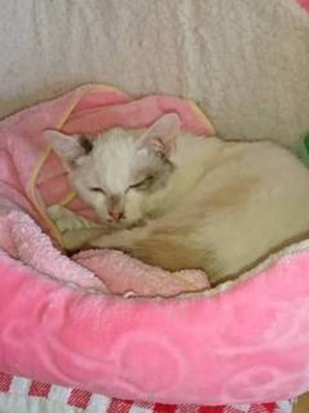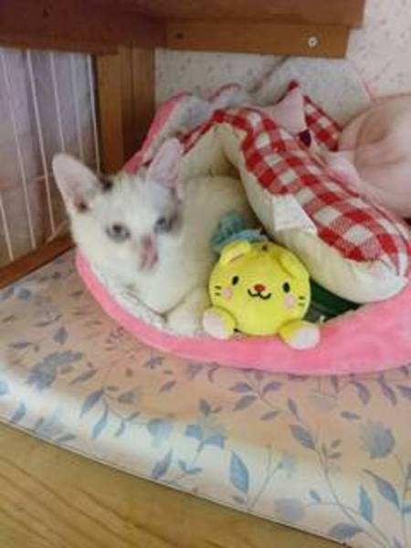 | 特徴(性格など) | 抱っこが大好きな、ブルーアイの女の子です。 クリーム色で、シャム猫のような色のブチが、三毛のようについています。 エイズ・猫白血病検査、どちらも陰性です。 ワクチン、検便、レボリューション済み トイレしつけ済み |