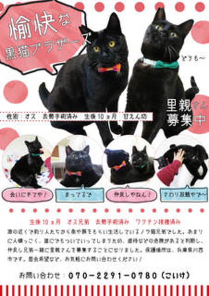 | 特徴(性格など) | 人に撫でてもらうこと、遊んでもらうことが大好きな黒猫兄弟です(^^) 去勢手術済み、ワクチン接種済み、ノミダニ駆除済み、 |
