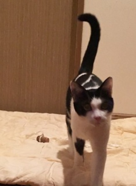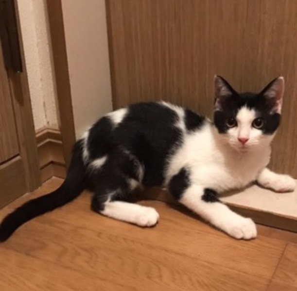 | 特徴(性格など) | 個性的な白黒混じりの模様がクールで小顔のイケメンくんです。黒くて長い尻尾をピンと立てて歩きます。食べるより遊ぶ方が好きで、ひとり遊びもできますが、慣れるとおもちゃを持ってきて一緒に遊ぼうと誘ってきます。好奇心旺盛な子猫です。 | ||