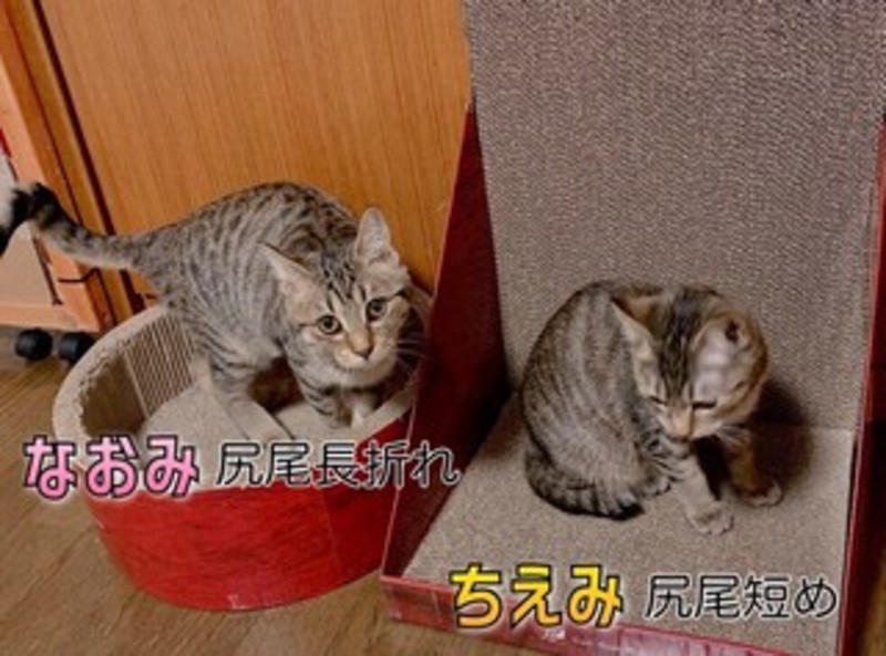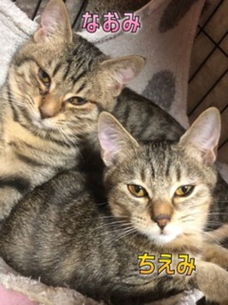 | 特徴(性格など) | ★ちえみ 性別:メス 推定生年月日:2018年9月ごろ しっぽ:短め 性格: 人の顔を見ると走って寄ってきて触ればゴロゴロ 猫より人間好き?でも、猫とも仲良く出来る♪大型犬にもビビらない♪ 癒し系女子です! ★なおみ 性別:メス 推定生年月日:2018年9月ごろ しっぽ:長くて折れている 性格: ちえみに比べると慎重派! 慣れるまではスリスリはしないけど、人に撫でられるとうっとりするタイプ。 お遊び大好き❗ホウキで掃除しているとぴょんぴょこ♪ 子鹿の様にホウキの周りを飛んで一人で遊んでいます。 基本性格は穏やか、他の子とも争いなく過ごせる子です! −−− キジトラ柄の仲良し姉妹! とっても仲良しなので2匹一緒のお迎え大歓迎です♪ |