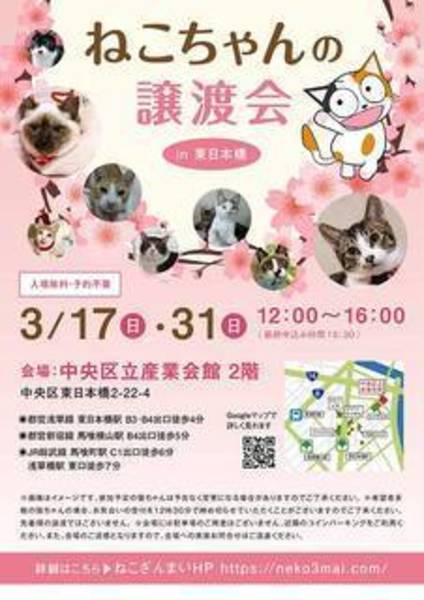 | その他(譲渡条件など) | 3月17日(日)12:00〜16:00(最終申込15:30) ねこざんまい譲渡会に参加予定です! 《会場のご案内はこちら》 https://ameblo.jp/neko3mai/entry-12445058102.html 希望の猫ちゃんがいる場合は、12時に会場へお越し下さい。 先着順ではございませんが、同じ猫ちゃんに複数名の希望者さまがいらっしゃる場合は、12時半にお見合い受付を締め切らせていただく場合がございます。 《家族募集中猫ちゃん一覧はこちら》http://www.neko3mai.com/entrycats/entrycats.html 《いつ里里親会情報ページはこちら》http://www.satoya-boshu.net/keiji/viewtopic.php?f=3&t=4828 ★★★ご来場前に必ずご確認下さい★★★ 《里親様へお願いはこちら》http://www.neko3mai.com/condition/condition.html 参加猫ちゃんは、それぞれ保護主(実際に猫ちゃんを自宅に入れ、保護をしている方)が異なります。 詳しい条件なども異なる場合がございますので、会場内で直接保護主とお話ください。 〖共通条件〗 1.終生飼育 2.完全室内飼い 3.脱走防止対策へのご協力 4.避妊去勢手術 5.契約書類へのサイン 6.定期報告 7.医療費等の負担 当日の猫ちゃんを連れて帰ることはできません。後日、保護主が里親様のご自宅までお届け致します。 その為、移動の際の猫ちゃんの負担を月齢などから考慮し、お届け地区を限定させて頂くこともございますのでご了承ください。 |