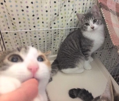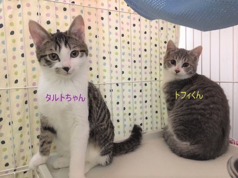| 特徴(性格など) | 仮名:トフィくん エイズ・白血病共に陰性 ノミ取り・検便・駆虫・去勢手術・トイレ躾済み とってもかわいいのですがとっても怖がりで「来るなウー!見るなウー!」と唸っています。ひっかいたり咬んだりはありません。 ウーとかシャーとか言っていますが、怖くないので「唸ったお顔もカワイイね~ハート」なんて言いながらしばらく同じ部屋にいると、唸るのをやめてこちらを観察しています。 機嫌のいい時は指を近づけると鼻ちゅーをしてくれたり、撫でさせてくれたり、ゴロゴロ言ってひっくり返ってお腹を撫でさせてくれる事もありますが、まだまだ人間が怖いので、人間に心を開いてくれるようになるまで数ヶ月はかかると思います。 お届け後は出来たらリビング以外のなるべく静かなお部屋にケージを置いて頂き、最低1週間はケージの中のみでの生活、その後ケージを開けてお部屋の中のみ自由にさせるという状況で数ヶ月過ごせる環境を希望します。 リビングデビューは、最初のお部屋の中で、トフィくんの方からすり寄って来たり触らせてくれるようになってからにされた方が良いと思います。 非常に慎重で、つり橋を何度叩いても渡らないタイプなので、保護する時、大変でした。 大きな猫さんは好きなようです。 若いオスの先住さんがいるお家、またはきょうだいのタルトちゃんと2匹一緒にお迎え頂けるお家とのご縁をお待ちしております。 |