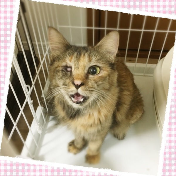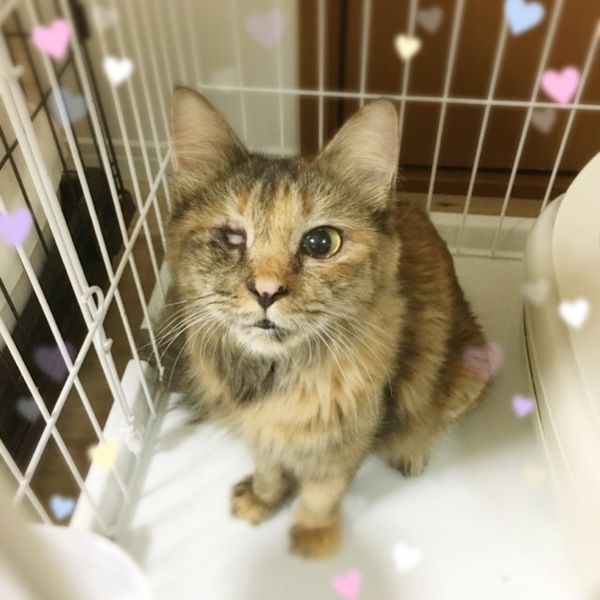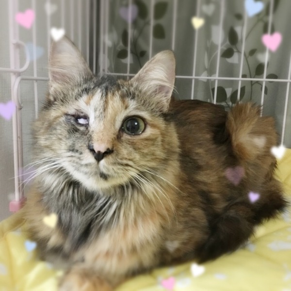 | 特徴(性格など) | 【猫の仮名】ケイトちゃん(担当 河井) 【毛色・柄】半長毛サビ 元飼い猫のため、慣れています。 抱っこもできます。 人間大好き、猫大好き。 家族の一員として、生涯大切にして下さる方を募集しています。 猫ちゃんの生涯を考え、高齢者のみのご家庭の方はご相談ください。 |
