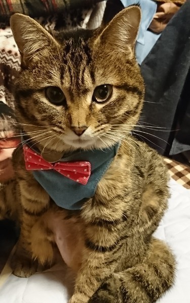 | 特徴(性格など) | 正統派キジトラ猫避妊しました。膝上が大好きな甘えん坊です。猫ちゃんは、苦手なので一匹飼い向きです。 お留守番出来ます。抱っこ出来ます。 お洋服も着れます。よく哭きます‼️ |