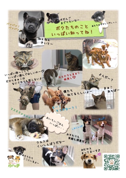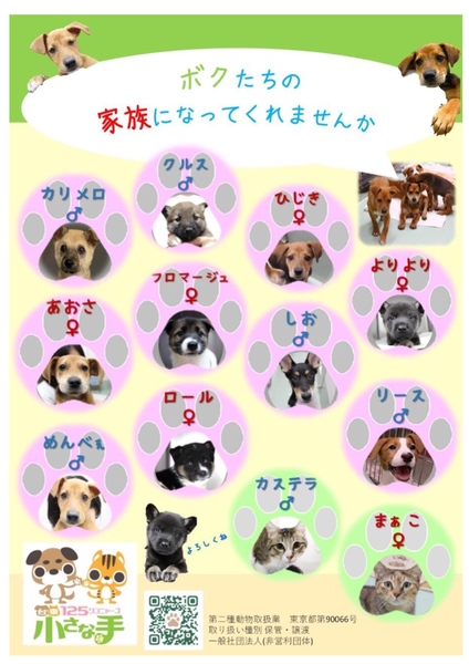 | 里親募集する理由 | 代理投稿 まだ生後2カ月位〜生後半年位のとっても可愛い雑種の子犬達男の子5匹、女の子5匹の10匹ฅ•ﻌ•ฅ里親様を募集しております! この子達は保健所に収容され殺処分寸前だったところをレスキューされ【一般社団法人台東125小さな手】のシェルターへやってきました。 誰にでも尻尾フリフリ(^^)とっても人懐こくて愛嬌たっぷり、子犬らしさ全開!中にはまだ怖がりさんな子もいますがどの子も甘えたい盛りの幼いちびっ子達です。トイレトレーニングも一生懸命頑張っていますฅ•ﻌ•ฅ (中型〜大きめの中型犬サイズに成長すると思われます) ※出来たら過去に中型犬〜大型犬の飼育経験がある方 ※東京都在住のご家庭 (千葉県、神奈川県、埼玉県は、要相談) ※お子様が小学校高学年以上のご家庭 (アレルギー検査をお願いする場合がございます) ※お留守番時間5時間以内 を条件にて里親様の募集をしております。 現在東京都台東区のシェルターにて、保護犬仲間達と一緒に仲良く元気いっぱい、素敵なご縁を待っています! どうぞ宜しくお願い致します♡家族に迎えてこれからの時を共に過ごして頂けませんか。 ☆3/30土曜日、3/31日曜日の2日間、10時半から17時まで譲渡会を開催致します。予約の必要はありません。是非可愛い子達に会いに来てください(^^) 開催場所:桜橋 花祭り 隅田公園・山谷堀広場(桜橋たもと・リバーサイドスポーツセンター隣) http://www.city.taito.lg.jp/index/event/kanko/sakurabashihanamatsu.html 隅田公園・山谷堀広場へは ・東京メトロ銀座線 浅草駅 徒歩10分 ・東武スカイツリーライン 浅草駅 徒歩10分 ・都営地下鉄浅草線 浅草駅 徒歩12分 となります。 ※外に繋いで飼う、や、納屋、犬小屋、バルコニー、玄関で、ずっとゲージやサークルの中で、という飼育をする方は御遠慮下さい。 家族の一員として、家族と一緒に室内での生活を【室内飼育】と位置付けております。 |