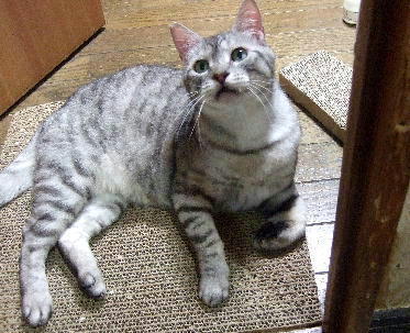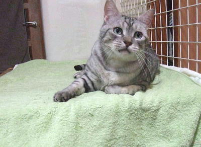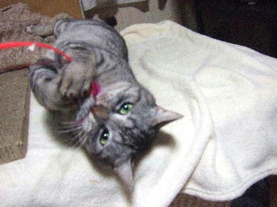 | 特徴(性格など) | アメショ-MIX グリ-ンの瞳がきれいな美形の銀蔵君です。 玩具で遊ぶのが大好きです。 性格はとても穏やか。争いが苦手でとても優しい子です。 集団生活だったため、猫社会のルールはわきまえています。 |