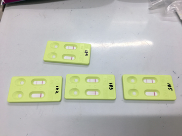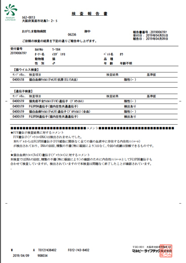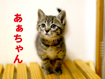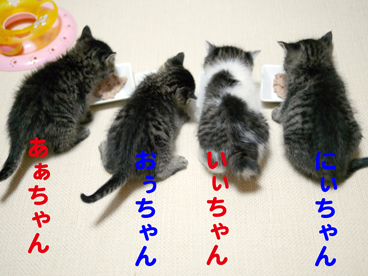 | 特徴(性格など) | 仲良し4兄妹 何らかの事情で家猫が産んだ子猫を、生後4週間程育て、離乳したのを機に遺棄されたものと思われます。 保護された時の体調も良く、下痢などもありませんし、ノミもいませんでした。 人慣れもしており、離乳食も良く食べています。 現在は猫の幼稚園の子猫室で元気に遊びまわっています。 仮名:にぃちゃん(雄) 長男坊でフードファイター! 仮名:あぁちゃん(雌) おしゃまさんです 仮名:いぃちゃん(雌) おっとりお甘えっ子 仮名:おぉちゃん(雄) 末っ子で食べるのが一番下手でしたが、近頃かなり上手になりました 全員 ・駆虫済 ・パルボ遺伝子検査 陰性 ・猫エイズ 陽性 ※簡易検査で全員陽性とでましたので、おぅちゃんの血液で遺伝子検査実施。 結果陰性でした。 これにより全員親猫からの移行抗体が簡易検査のキットに反応したものと判断できます。 生後半年くらいで、自己免疫で移行抗体を排除し、陰性になります。(主治医の診断有り) ・猫白血病 陰性 ・ワクチン一回済み |