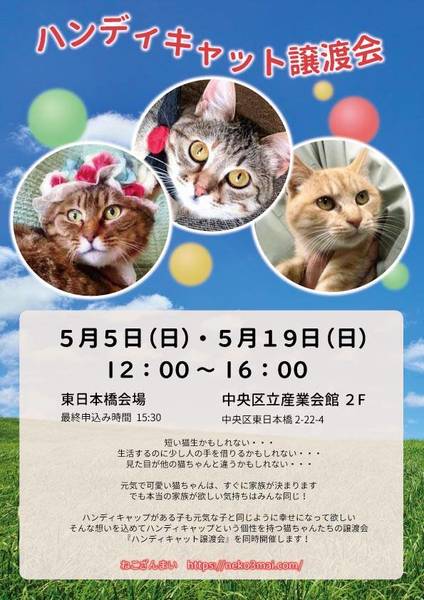 | 特徴(性格など) | 5月19日(日)12:00~16:00(最終申込15:30) ねこざんまい譲渡会に参加予定です! 猫ちゃんとのお見合いは譲渡会場となります。 どうぞ【ねこざんまい譲渡会】にご来場下さい。 ※譲渡会ご来場につきまして、事前予約は不要です 《会場のご案内はこちら》 https://ameblo.jp/neko3mai/entry-12460948419.html 希望の猫ちゃんがいる場合は、12時に会場へお越し下さい。 先着順ではございませんが、同じ猫ちゃんに複数名のご希望者さまがいらっしゃる場合は、12時半でお見合い受付を締め切らせていただく場合がございます。 ※譲渡会ご来場につきまして、事前予約は不要です ★★★ご来場前に必ずご確認下さい★★★ 《里親様へお願いはこちら》 http://www.neko3mai.com/condition/condition.html 《家族募集中猫ちゃん一覧はこちら》 http://www.neko3mai.com/entrycats/entrycats.html ◆ 名 前 ◆ ノエルくん ◆ 年 齢 ◆ 7歳前後 ◆ 性 別 ◆ 男の子 抱っこすると、一日中そのままなのではないかというほど、落ち着いてくれます。 仔犬に悪戯されても怒らない穏やかな子です。 断脚している為に、現在はまだ高いところに登ろうとしたりはしませんが、体が慣れればもっと活発に動いたりするかもしれません。 生活するのに断脚したから不便そうというところは無く、良く食べておトイレも上手にできます。 ペットではなく、共に暮らす家族としてお迎えいただけるご家庭を希望しています。 |