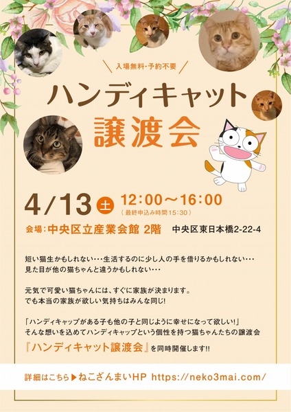 | その他(譲渡条件など) | ★仔猫ご希望の里親様★ 仔猫ちゃんたちは、まだ体がしっかりしていない赤ちゃんです。 下痢だけでも数時間対応ができなかっただけ死に至る事もあります。 その為、月齢に応じたお留守番時間を設けさせていただいております。 また、子猫ちゃん(6ヶ月未満)の里親様には子猫支援金のご協力をお願いいたしております。 ★猫ちゃんとのお見合いは譲渡会で!★ ねこざんまいの猫ちゃんは譲渡会でのお見合いのみとなります。 『この子はいつ譲渡会に参加するの?』『譲渡会場の場所はどこ?』など はねこざんまいホームページをご覧ください。 https://neko3mai.com/ ★楽しく猫ちゃんと触れ合って♪★ ねこざんまい譲渡会は、猫ちゃんも里親様も保護主も笑顔で過ごせる譲渡会を目指しています。 これから20年以上、楽しい時も、悲しい時もいつも傍にいてくれる大切な家族になる猫ちゃんです。 会場には沢山の猫ちゃんがいます。 1匹1匹、触れ合って猫ちゃんとお話ししてください。 『初めて猫ちゃんを家族に迎える方』 『先住猫ちゃんのお友達を迎える方』など トライアルの仕方や先住猫ちゃんと仲良くなるコツなど経験豊富な保護主やスタッフにお気軽にご相談ください! 猫を愛し、そして猫に愛されている猫好きスタッフと保護主がアドバイスさせていただきます。 ★里親希望のみなさまへ★ ペットではなく、家族一員としてたっぷり愛情を注いでくださるご家庭をお待ちしております。 恐れ入りますが、 ・学生の方 ・一人暮らし、同棲中の方 ・子猫、若猫希望の60歳以上のみのご家庭 ・脱走防止対策にご協力いただけない方 は原則お断りさせていただいております。 ただし、預かりボランティアさんとして新しい家族が決まるまでの間、猫ちゃんを預かっていただく道もございます。 参加猫ちゃんは、それぞれ保護主(実際に猫ちゃんを自宅に入れ、保護をしている方)が異なります。 詳しい条件なども異なる場合がございますので、会場内で直接保護主とお話ください。 〖共通条件〗 1.終生飼育 2.完全室内飼い 3.脱走防止対策へのご協力 4.避妊去勢手術 5.契約書類へのサイン 6.定期報告 7.医療費等の負担 当日の猫ちゃんを連れて帰ることはできません。後日、保護主が里親様のご自宅までお届け致します。 その為、移動の際の猫ちゃんの負担を月齢などから考慮し、お届け地区を限定させて頂くこともございますのでご了承ください。 |