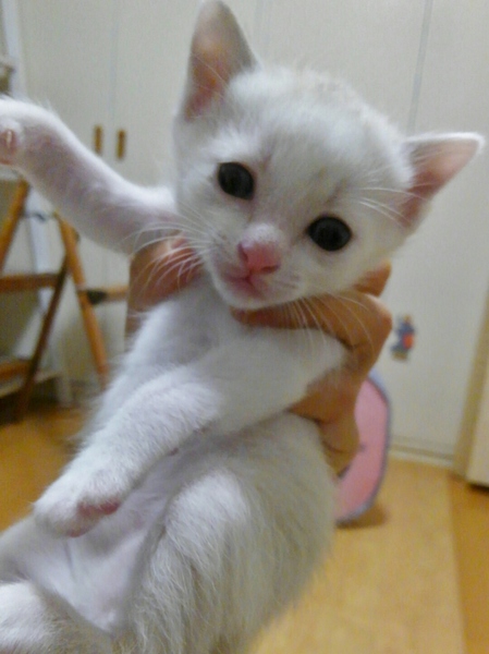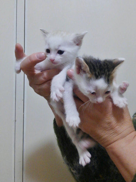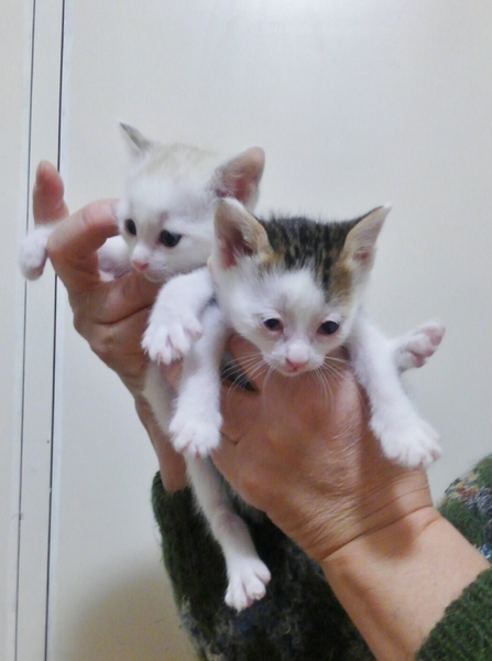 | 特徴(性格など) | 生後約一カ月です。 どちらもで400g~450gくらいです。 白い子が女の子(耳と尻尾が薄いグレーです。) 白キジくんが男の子 白キジ(男の子)が風邪をひいており、メヤニがおさまらず、眼軟膏よ抗生剤で治療中です。 ですが眼に白い濁りが出てしまいました。 食欲は大盛で体調は問題ないようです。 こんな眼ですがとても可愛い子です。 獣医さんはこのまま様子見でとのことです。 まだ幼な過ぎるので、ワクチンやウイルスチェックは出来ません。 どうかご了承下さい。 母猫や子猫の姉(昨年の子)はウイルスマイナスです。 |