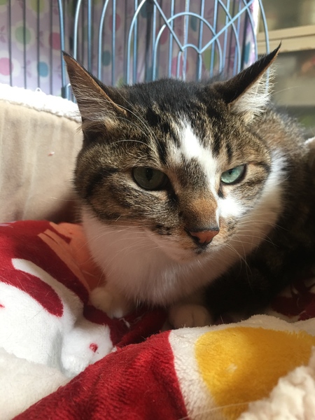 | 里親募集する理由 | H30.12月、名港にて一緒に暮らしていた独居のおばあさんが認知症・圧迫骨折のため入院⇒施設へ。この子は1匹で放り出されてしまい、おばあさんの担当のケアマネさんとヘルパーさんが必死に命を繋ぎ、幸せ探しの為に我が家にやってきました。 やって来た当初は環境の変化とおばあさんがいない!(おばさんならいたけど)って事で全く食べず、動かず、一体どうなる事かと思っていたのですが、少しずつ少しずつ環境に慣れ、他の猫さんや人間にも慣れ、可愛らしい家猫ぶりを発揮できるようになってきましたので、本格的に幸せの終の棲家を捜すことにしました。 宜しくお願い致します! |