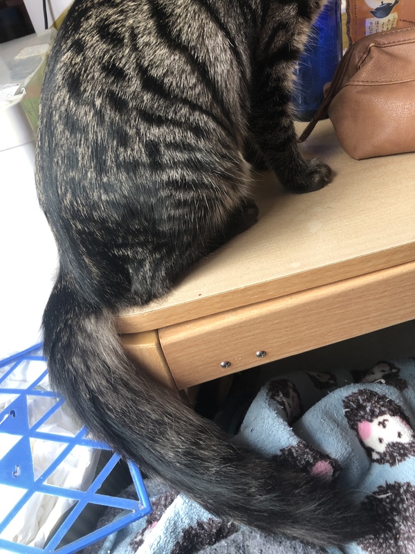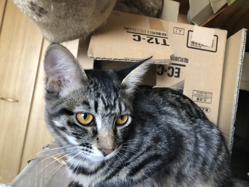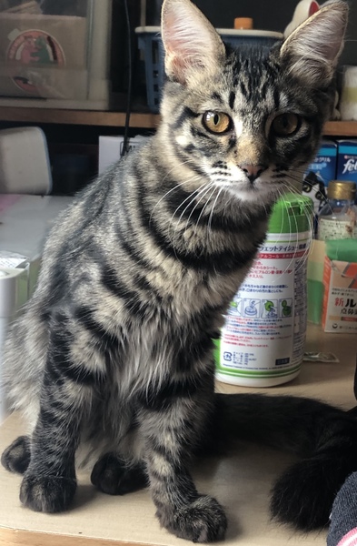 | 特徴(性格など) | キジトラ(黒め)ロング 尻尾が長い カラカラ音するものが好き 怖がり 甘え下手 |