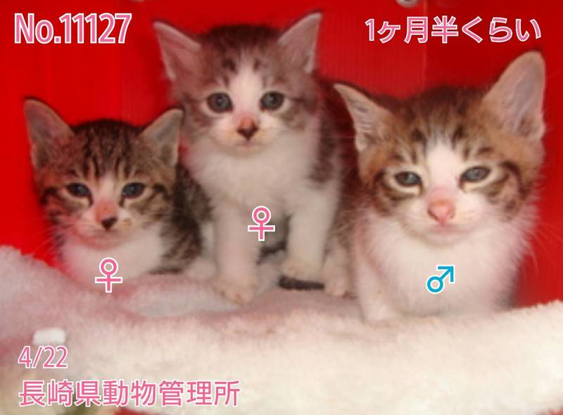 | 里親募集する理由 | 県外の方でも譲渡条件が合い、直接来所でお迎え可能であれば里親になれますのでどうぞ宜しくお願い致します! 突然連れて来られて収容され、どんなに寂しく心細いか。1日も早く温かい家庭の中で過ごさせてあげたいです。 ☆完全室内飼育にて家族として迎えて下さる方は、「引き渡し方法」にあります【アンケート】にお答えいただけますようお願い致します。 まだ生後1か月半位、そっくりな可愛い白キジちゃん3兄妹が収容されました。 写真左=メス(写真中央=メス)(写真右=オス) 助けを待っています! 人馴れしていて甘えん坊で可愛いです! 残念ながら長崎県は28年、29年度と殺処分数全国ワースト1位です。 ☆猫を飼養飼育していく為には日々、食費、医療費、トイレシート、猫砂以外にも経済的に費用がかかります。 時にはいたずらをして困らせる事もあるかもしれません。 年をとれば人間と同じ様に介護も必要になります。 可愛い可哀想というだけの安易なお気持ちでのご応募は猫にとっても幸せな事ではありません。深い愛情と責任を持ち終生完全室内飼育、避妊手術の出来る方 の、ご応募をお待ちしております 。 ※まだ幼く長時間のお留守番はできません。なるべくお留守番が少ないご家庭が望ましいです。 ?※土日祝がお休みの為、お迎えは平日のみとなります、又、先着順譲渡されている場合もございますので必ず事前にご確認、一度こちらへご連絡宜しくお願い致します。 良いご縁をお待ちしております(๑•ᴗ•๑)♡ |