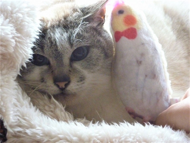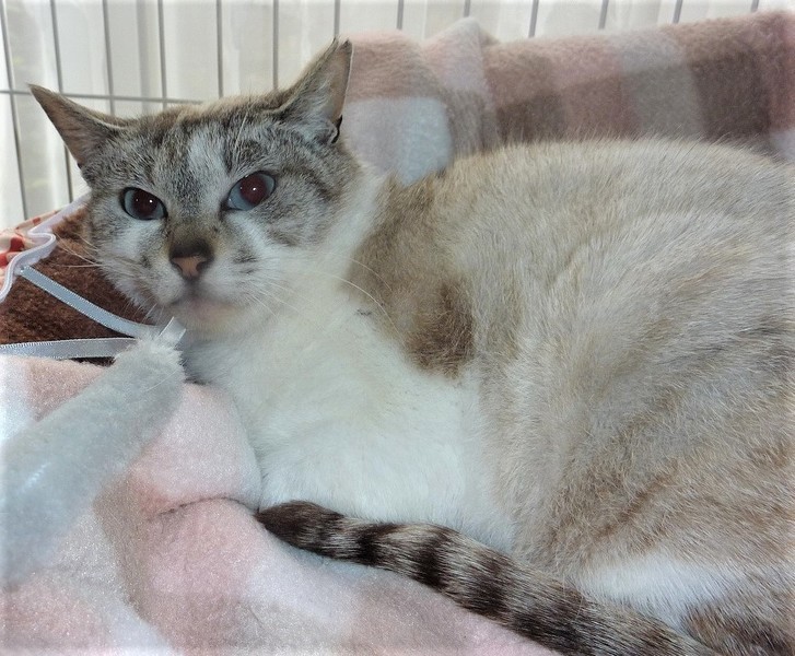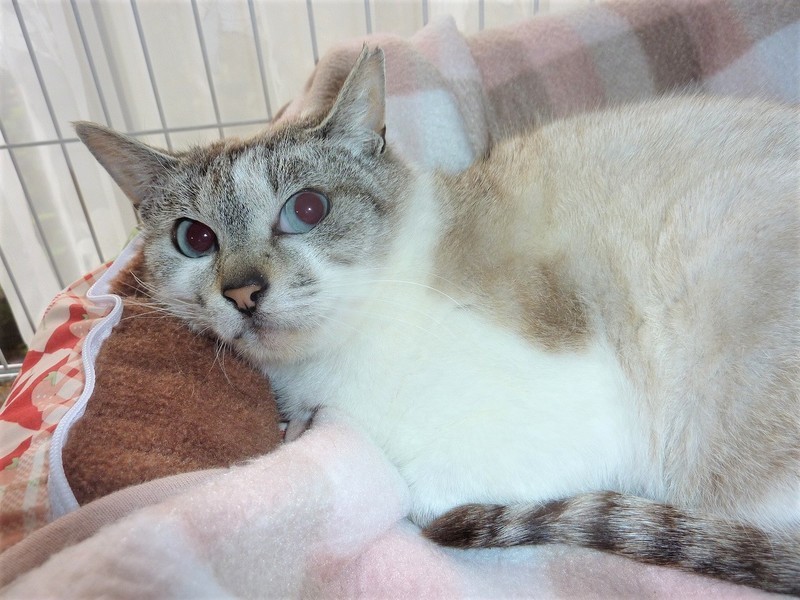 | 特徴(性格など) | 小柄なシャムミックス、ブルーアイの女のこ。 病院では1歳位と言われていますが、餌をやっていた人の記憶では2年はいるとの事です。臆病なところもありますが、オス猫には気の強い所をみせます。 最近まで外にいました。その時にオス猫に追われていたために、怖がって威嚇してしまいます。人とのスキンシップが好きで、特にブラッシングが好きです。猫じゃらしで一緒に遊ぶのも好きですが、じゃらしでの一人遊びも好きです。1頭飼いか優しい先住猫のいるところが良いと思います。 のみ取り済 検便、駆虫済 ワクチン済 避妊手術済 猫エイズ・白血病ウィルス検査はともに陰性です |