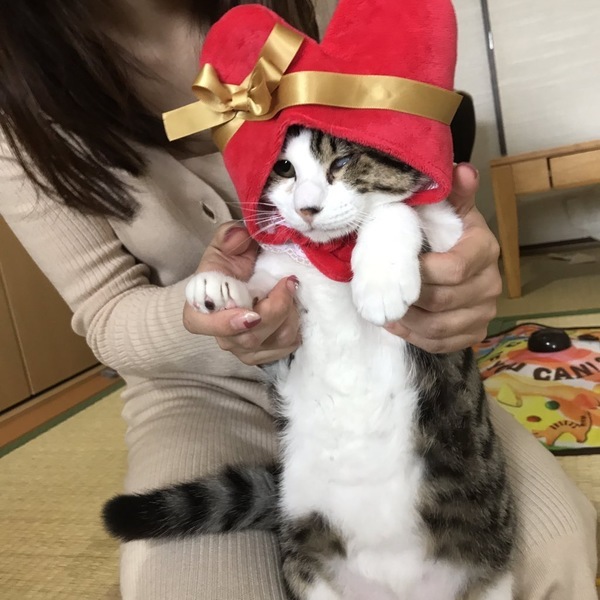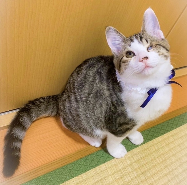 | 特徴(性格など) | 仮名:ルミエル 体重:5キロ 毛色:キジ白(ですが、光の角度でサバ白にも見える、芸術的な美しい色合いと模様) 一番の魅力は、天使のような愛くるしい外見に、とにかく大の人間好きな性格! 下記で詳しく紹介していきます。 ☆外見☆ 大きくつぶらなお目目とウインク☆ ピンクのお口はいつでもニッコニコ、天使の笑顔 優しいグレー色の縞に、粉雪のような白いフワ毛 ハッキリくっきり美しい模様 色もキジとサバがほんのり交わり、光の当たり方で色が変わる、自然な美しさ 見た目や雰囲気もふんわりしていますが、実際触っても モチモチふわふわ、しっとりの触り心地… まるで天使みたいな愛くるしいお顔。 片目でも(だからこそ?)完璧な可愛さを持つ子なのです。 加えて、身体の模様はお坊さんの袈裟を着ているような、何とも有難~い子猫です(笑) 見ているだけでも、モチふわに触っていても、傍にいても、遊んでも、常に癒される事必至です! ☆性格など☆ 天真爛漫で純粋無垢で、 そして「とにかく大の人間好き」! 生まれたての天使のような子です♡ 人なつこい兄弟の中でも一番の懐っこさで人がだ~~~い好き! 初めて会う人にも、すぐにゴロゴロ言って甘えたり、お尻を持ち上げて撫でてアピールしたり、遊んでもらえば夢中でいつまでも遊んでいます。 嬉しくって、色んな所にスリスリして回っています。(笑) 場所見知りもしないどころか、病院ですら楽しそうに探検。 先生の胸元にくっついたり看護婦さんにも抱きついてチューまでするほどの懐きっぷり! どの先生たちからも、「こんな懐っこい子、めったにいない!」と大変驚き、そしてニコニコされます。 この子は本当に猫でしょうか? 人見知り場所見知りどころか、通常よりテンションが上がってはしゃぎまくり、甘えまくりのルミくんです♡ ふわふわベッドや人間の着ている服にフミフミ、チュッチュしてくる甘えんぼ赤ちゃんっぷりも♪ いつまでもチュッチュしています。 未来のご家族はキュン死しないように気を付けなければいけません(笑) ルミくんは表情も仕草もすごく豊かで、見ていて全く飽きません。 始めて猫を迎えるご家庭にも自信を持っておすすめできる、非常に一緒に暮らしやすい子だと思います。 先住猫さんのいるお家にも大変おすすめできる子です! 先住さんの性格にもよると思いますが、他の猫の事も大好きで初対面で威嚇する猫にすら好き好きモードで一切の物怖じを見せず近寄っていくのには保護主も大変驚いています。 我が家の猫達とも大変仲良く遊んでいますし、先住さんともきっとうまくやっていけると思います。 自分より大きい猫にもグルーミングして甲斐甲斐しく面倒を見る、本当に優しい子です。 ここからはルミくんのお目目についてお話しします。 片目を無くした事を、人間はつい可哀想に思ったり、日常生活の大変さを想像してしまうかも知れません。 現に、幸せになった他の兄妹と比べてなかなかお家を見つけてあげられず今に至っています。 しかし実際には、何匹も色んな猫を見てきた私から見ても、両目がある子と何も変わりません。 本ニャンは自分の目を全く気にしておらず、「そんなのへっちゃら!ぼく元気だよ!」とばかりに元気いっぱいに走り回っています♪ あまりに普通すぎて、というか、普通の猫以上に可愛すぎるのに目が行って、「そういえばルミくんは片目の猫ちゃんだったな」と、思い出すくらいです(笑) そのニコニコ笑顔と元気っぷりから、悲壮感はゼロ! ニコニコ笑顔と全身から溢れる「ぼく、あなたが好き♡」、「まいにち楽しい♪」オーラ全開で、ルミくんを見てると自然にみんなニコニコになります。 保護主の贔屓目でしょうか? いえ、今まで会った事のある方全員が「いたって普通の猫」である事実を保証し、その可愛さと元気っぷりに夢中になってくれています。 みなさん、「可哀想」ではなく「可愛い」の連発なのです。 一度会ってもらえればすぐに分かると思います^^ ルックスも性格も天使のようなルミくん♡ 本当のご家族は幸せ間違いなしです。 天使をお家に迎えてみませんか? ☆☆☆ツイッターやブログでのこの子の日々の様子や動画を見に来てください♪☆☆☆ ツイッター http://twitter.com/chatmi6 ブログ http://chachandaisuki.blog.fc2.com/ 【健康状態】 保護当時の猫風邪を治してからは、健康に何の問題もなく本当に元気いっぱいです! 食欲旺盛で快便。 (我が家ではトイレの失敗は一度もなく、システムトイレでも上手にします。) ・片目ですが、私も普段忘れているくらい(笑)、両目があるのと全く変わりませんのでご安心ください! 本ニャンも全く気にせず、思いっきり毎日走り回り楽しんで遊んでいます♪ ・猫風邪治療済み ・ノミ取り・駆虫済み ・FIV、FeLVともに陰性 (2019年2月現在) ・3種混合ワクチン2回接種済み(2018年9月、10月) ・去勢手術済み(2018年12月) ・その他、現時点で必要な基本医療ケアは終えています。 (今後、追加の医療ケアが発生し