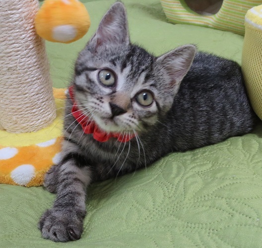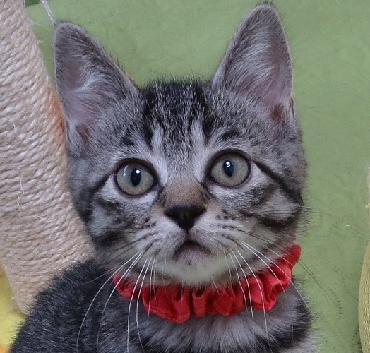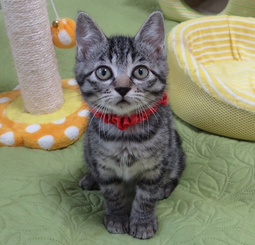 | 特徴(性格など) | 5月5日(日)ミャオ!ねこのおうち譲渡会に参加しますので、そちらに会いにいらしてください。 ◇仮名◇りんたんちゃん ◇毛色◇サバトラ ◇性別◇メス ◇性格◇ 兄妹3匹、各々毛色も雰囲気も違い、どの子にも洋猫ミックスの気配がある、不思議な兄妹の1匹です。 りんたんは特に、顔というか目というか、ちょっと表情が一風変わっています。 エキゾチックというかオリエンタルというか・・ともかく元気いっぱいで甘えん坊さん。 まだ小さいので性格は判りませんが、小さい時から人の手に触れているので、慣れ慣れの可愛いゴロゴロおチビさんです。 |