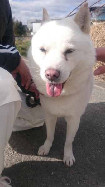 | 特徴(性格など) | 13キログラムの北海道犬の女の子です。お散歩に連れてって〜と手招きして呼ぶ姿がとてもかわいいです。人にとても甘えたがっています。ちょっとぽっちゃり気味なところと、真っ白で見事な毛並みがチャームポイントです。トイレはお散歩でしますし、他の犬とも友好的でとってもいいこです。ぜひ、この女の子に会いにきて一緒にお散歩してみてください。 | ||