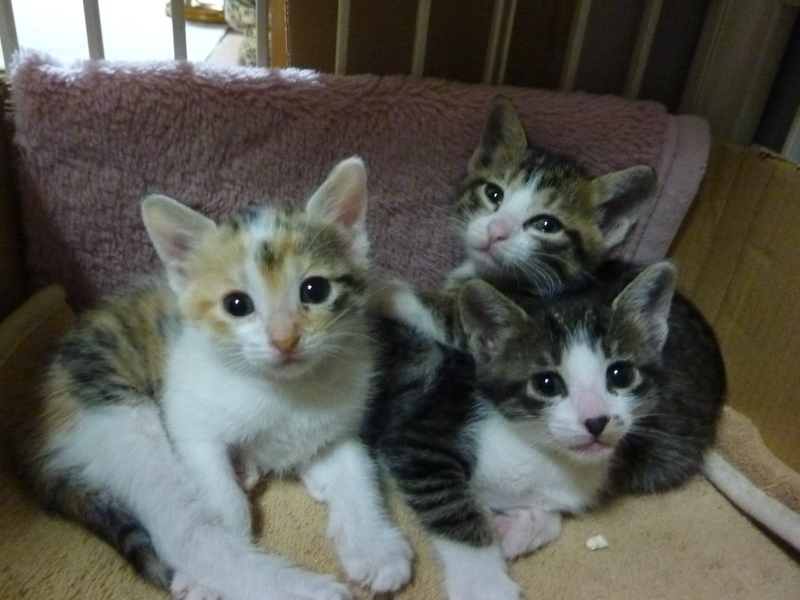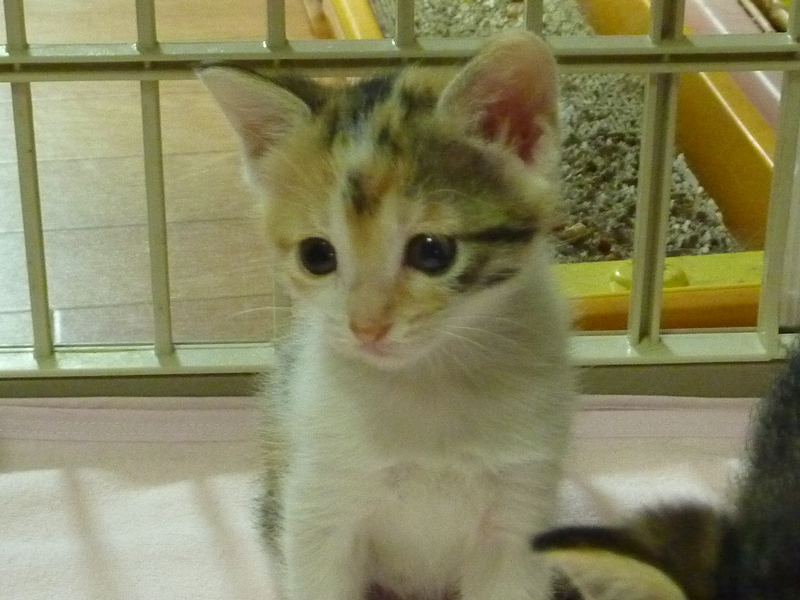 | 特徴(性格など) | 三毛の女の子とキジシロ2匹の3兄弟です。 3匹とも仲良く元気に遊んでいます。 |