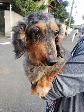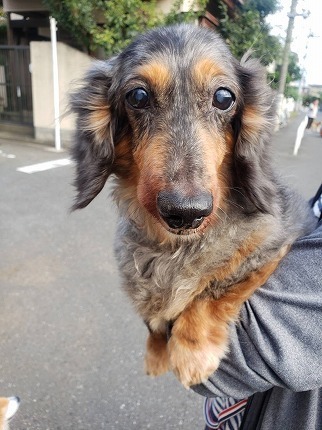 | 特徴(性格など) | ■特徴 仮の名前 バロン Mダックス♂ 推定 13歳前後 体重 5kg 毛色 シルバーダップル ■性格・暮らし ・ 天真爛漫で甘えん坊なシニアダックスです ・ 身体のどこに触れても嫌がらず、すり寄って甘えます ・ 人にも他犬にも攻撃性はなく穏やかです ・ お散歩は大好きで強い引きもありません ・ トイレシート認識あり、外でもトイレができます ・ ほとんど吠える事も無く、お留守番も上手です |