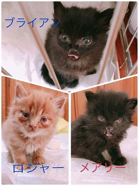 | 里親募集する理由 | 子猫の鳴き声がして、側溝をのぞき込んだところ、3匹を発見。 そばに母猫がいましたが、3匹とも目やにで瞼がくっつき見えない状態だっため保護しました。 その後姿を見せなくなった母猫をTNRをするため捜索中です。 |