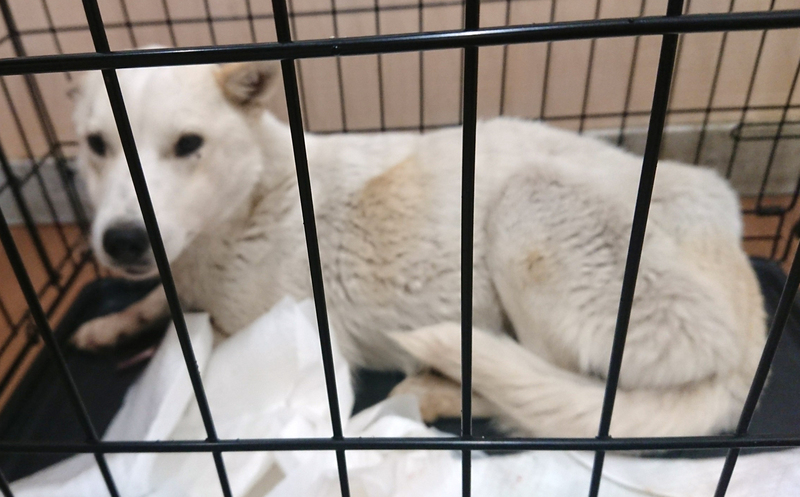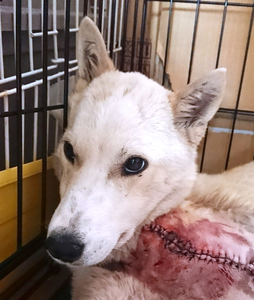 | 特徴(性格など) | 野犬とし生きてきました。 人と暮らした事がなく怖いため、まだケージの角でじっとしたままです。 怪我をして左前足が腐敗し、骨が出たままセンターに収容されていました。 センターから引き出し後、断脚の手術をしました。 術後良好で3本脚でも立ち上がって歩けるようになりました。 将来は歩いたり走ったりも出来るようになると思います。 2019年5月現在 体重12kg(痩せている) 療養と人慣れのため、ゆっくり穏やかに暮らして頂ける家族をさがしています。 |