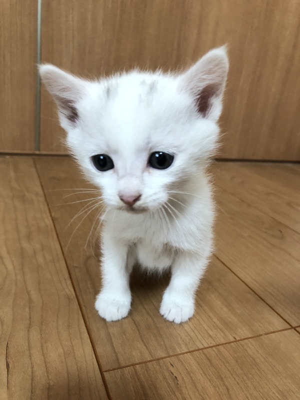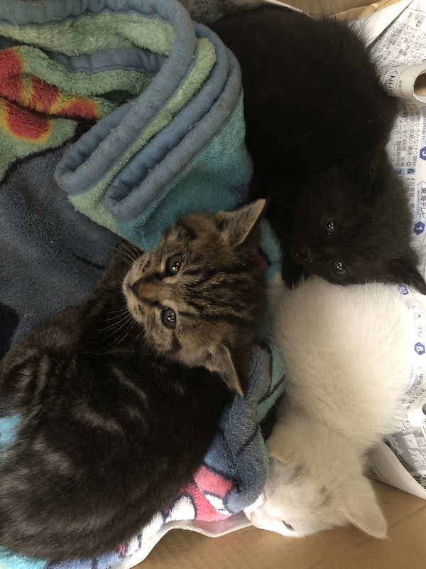 | 特徴(性格など) | 生後3週間程度の3兄弟です。 白の子は 青目 おとなしいです。 黒の子は グレー目 活発です。 トラ柄の子はグレー目 好奇心旺盛です。 まだ小さいため性別はわかりません。 3匹で丸くなって眠ったり、よちよち歩きまわったりとても可愛い子たちです。 今のところ体調不良は見られませんが、黒の子とトラの子は若干目やにがみられます。 健康診断、ワクチン接種などはいまのところ行っていません。 |