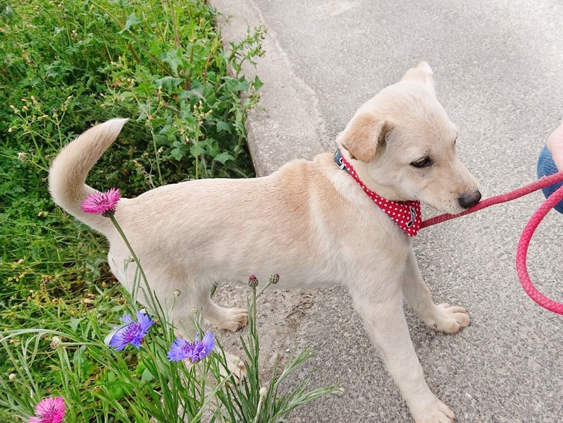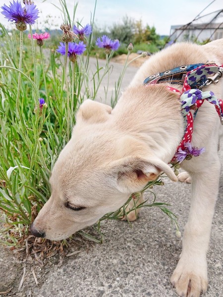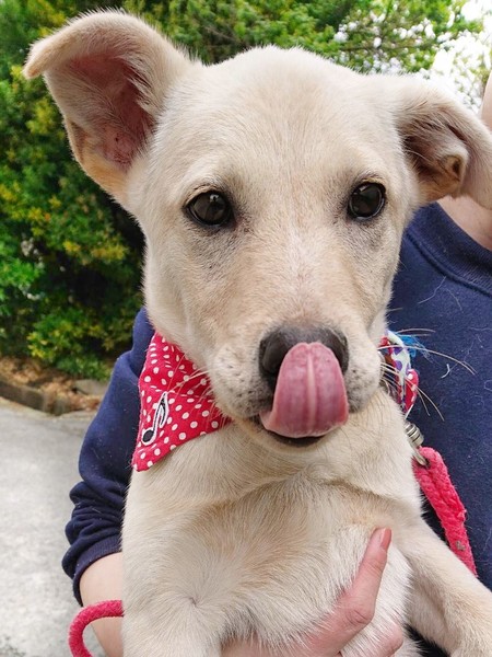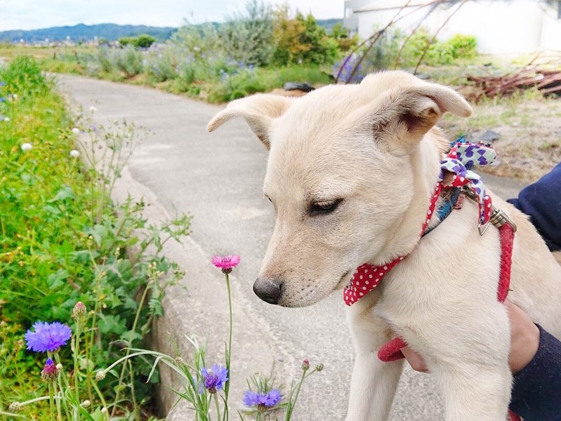 | 特徴(性格など) | 白っぽい子犬の女の子です。親犬に愛されて育ちました。人なつこく、甘えん坊です。素直にすくすくと育っています。 | ||