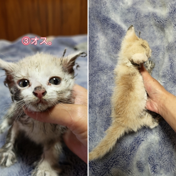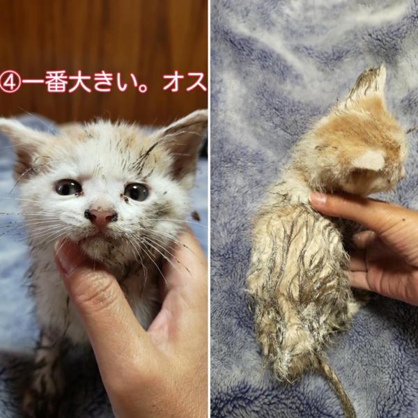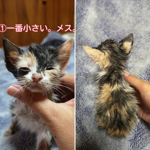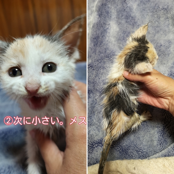 | その他(譲渡条件など) | 保護した時にトリモチ的な物が体中に付いており、取れません。病院に聞くと小さいので洗わない方がいいと。(低温になる為)他のゴミ等が付かないように小麦粉を付けとく事を言われたので、小麦粉を付けています。 なるべく取る努力はしますが、結構ベタベタしておりますので、渡す時にもベタベタした物が付いている事を理解した上でお願いします。それと、ベタベタを軽減する為、所々毛をハサミでカットしています。虎刈りっぽいです。でも、毛はすぐ伸びますので。 譲渡条件は、最期まで飼ってくれたら、それだけで十分です。問い合わせ、質問だけでもいいので、気軽に問い合わせて下さい。 |