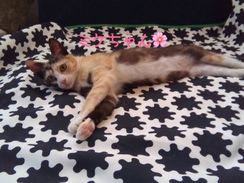 | 里親募集する理由 | 自宅近くに猫が多く、その中にミケちゃんがいました。 風邪をひいていて、口内炎で口から出血し、目や口も塞がって口呼吸をしていました。 とても可愛い子でしたので、病院で治療をして、里親募集をするために保護致しました。 (保護主様情報) |