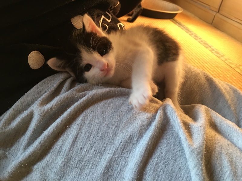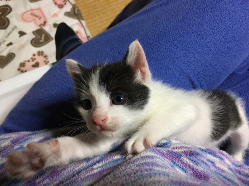 | 特徴(性格など) | 黒白で性別がまだハッキリしません。多分女の子かな? 3兄弟の中で一番甘えん坊ですぐ抱っこしたがります。一番身体が小さい子ですが一番賢い子です。 背中に隠れミッキーが!?(笑) |